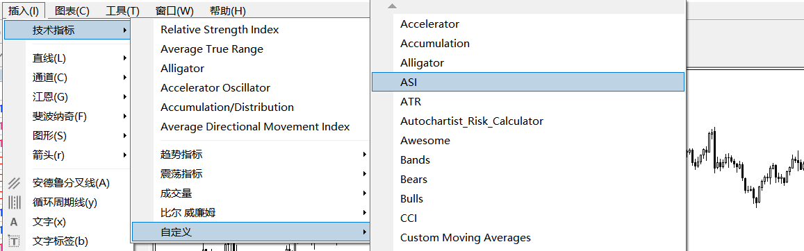 其中一些指標如ASI振動升降指標可能外匯投資者比較少瞭解。在這裡,就附帶介紹一下ASI振動升降指標的使用。這一指標載入之後,一眼看去與蠟燭圖走勢基本一致,不仔細看看很難辨別差異。ASI指標需要關注的是0軸的狀況。