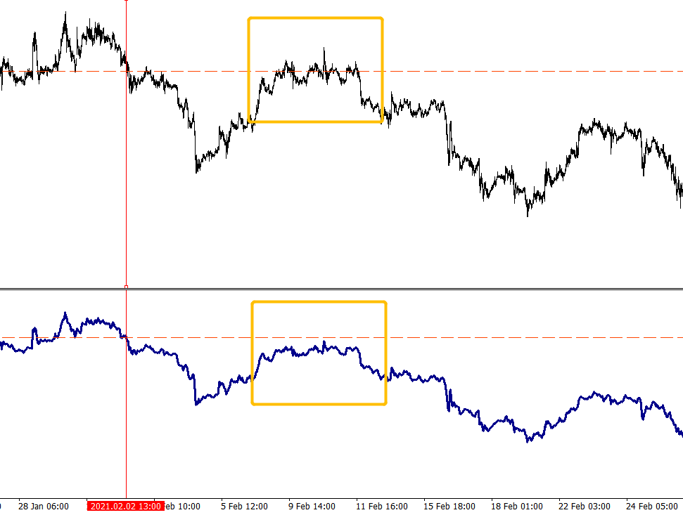 ASI使用的時候,就是要找到0軸附近的指標走勢與走勢圖的差異。在下跌過程中,首先找到ASI指標跌破0軸的時刻,畫一條垂直線標記;然後在K線圖中找到對應時刻的價位,在這一價位水準畫出一條水平線。